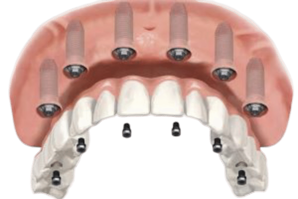 En casos donde el hueso o las necesidades del paciente lo requieren, utilizamos All-On-6, colocando seis implantes para mayor soporte y estabilidad.